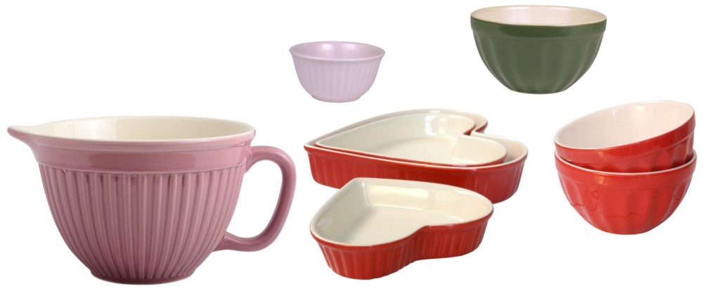 Zu sehen ist eine kleine Auwahl unserer Schüsseln und Formen von Ib-Laursen. Links: Rührschüssel 2075-35; Mitte oben: Kleine Müslischale 2090-04; Mitten unten: Auflaufform in Herzform rot 2087-33; Oben rechts: Grüne Müslischale 2078-45; Unten rechts: Rote Müslischale 2078-33