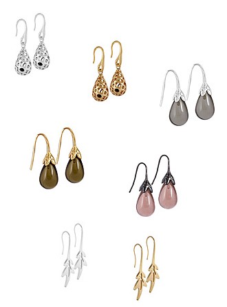 Links oben: Champagne earrings worn Rhodium (v101); Oben mitte: Champagne earrings worn gold (v102); Rechts oben: Fall earrings worn silver (v221); Mitte links: Fall earrings worn gold (v228); Mitte rechts: Fall earrings worn hematite (v229); Unten links: Leaf earrings worn Rhodium (v471); Unten rechts: Leaf earrings worn gold (v472)