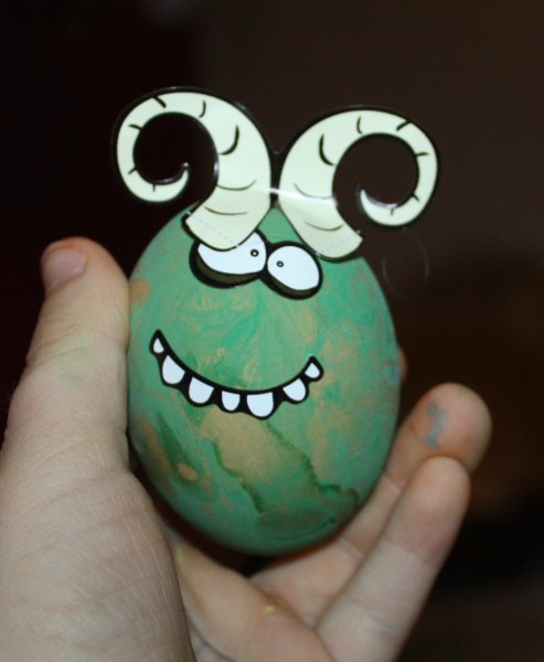 Osterei Nr. 1 aus dem Ostereiwettbewerb 2013 zum Thema „Dänemark“ zeigt ein als Wikinger getarntes Osterei mit Hörnern.