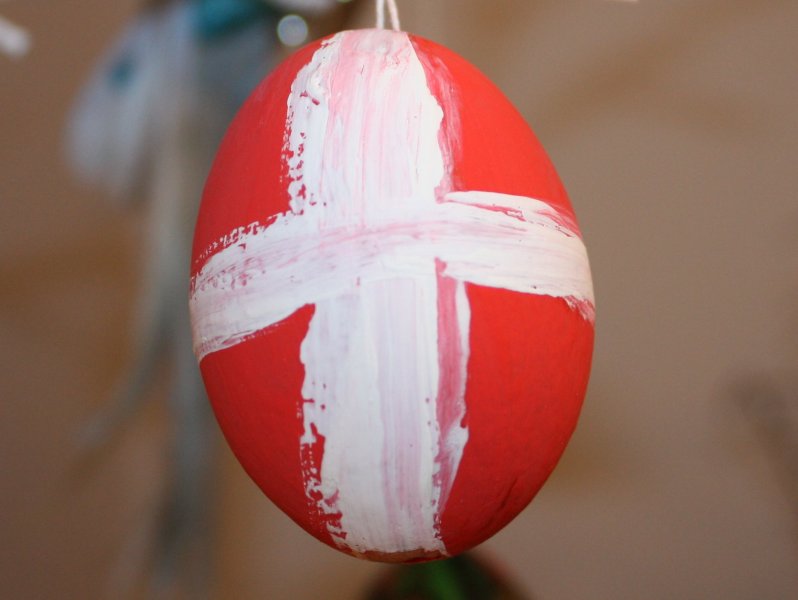 Osterei Nr. 11 aus dem Ostereiwettbewerb 2013 zum Thema “Dänemark” zeigt ein selbstgemaltes Osterei mit rotem Untergrund und weißem Kreuz. Es ist also ein „echtes“ Dannebrog-Ei.